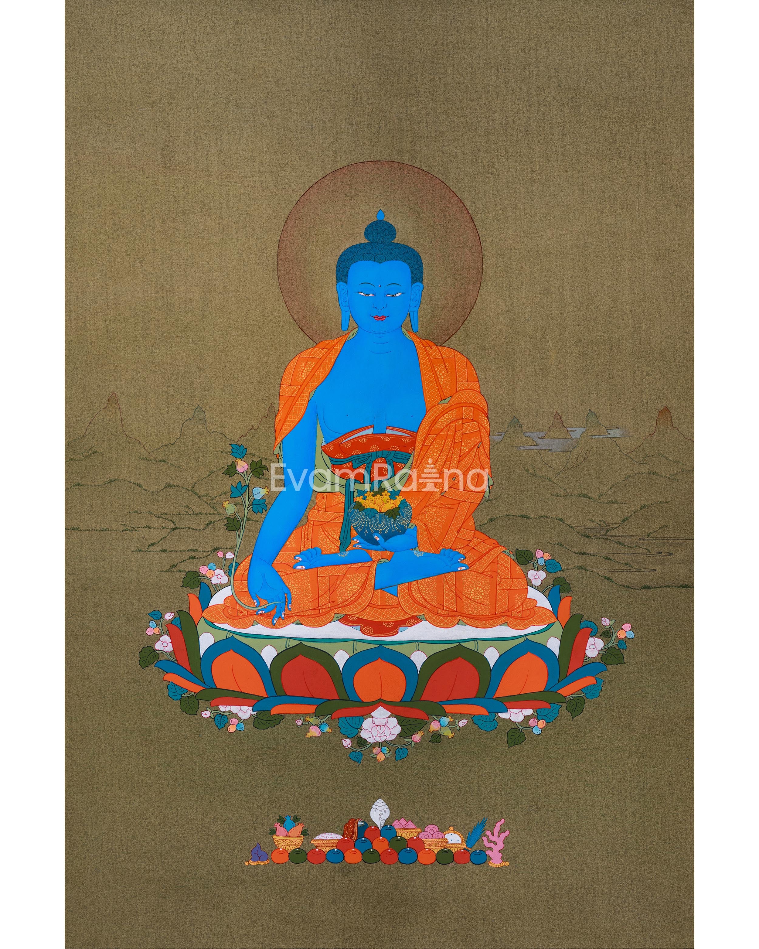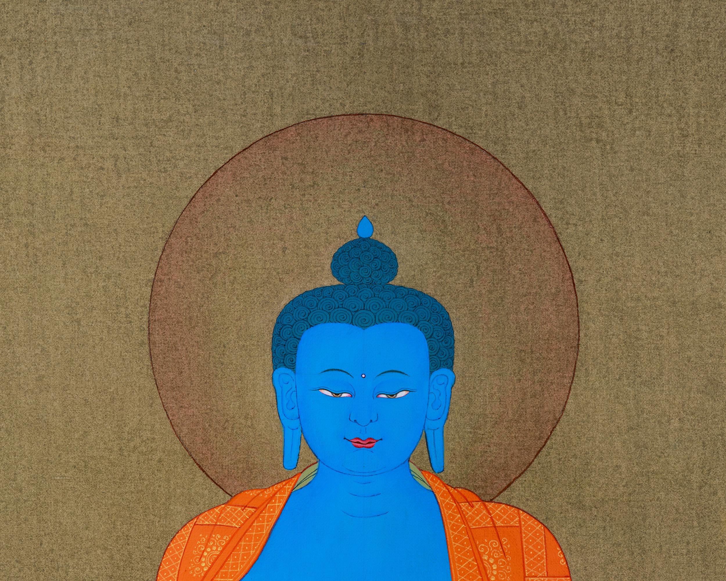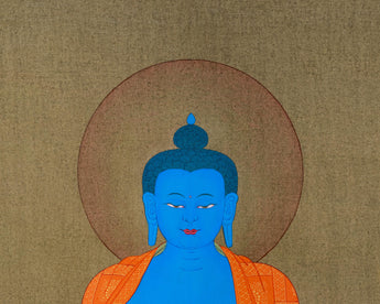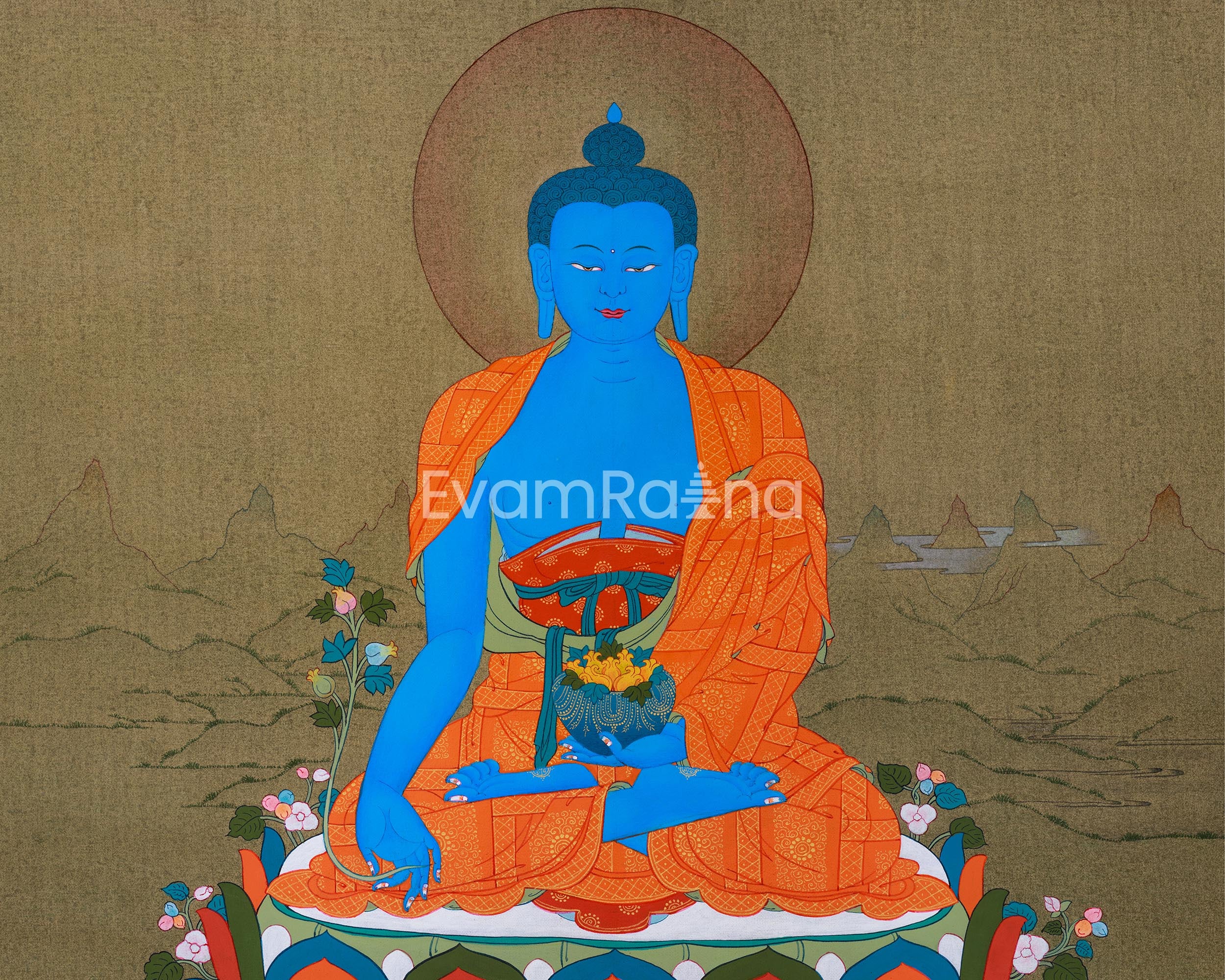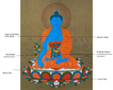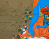 Experience the healing powers of the Medicine Buddha with this stunning Thangka art piece. Perfect for meditation and spiritual practices, this intricately crafted art invokes feelings of peace, serenity, and wellness. Bring balance to your space and mind with this beautiful artwork.