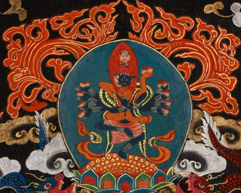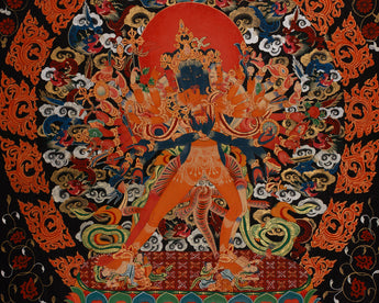 Heruka Chakrasamvara is depicted with twelve arms, and each grasping distinct ritual implements that symbolize his extensive abilities and attributes in overcoming obstacles on the journey to enlightenment. His dynamic and fierce posture, along with the embrace of his consort, effectively represents the fusion of compassion and insight, fundamental to tantric practices. The multiple heads of Heruka Chakrasamvara illustrate his all-knowing nature, with each head reflecting different facets of his enlightened mind and control over various levels of consciousness. This element emphasizes the deity's comprehensive awareness and ability to perceive all dimensions of existence. The glowing halo, often illustrated as flaming, represents divine illumination and the transformative power of enlightenment, accentuating Heruka Chakrasamvara's role in turning ignorance into wisdom and enhancing the majestic and awe-inspiring nature of his portrayal.