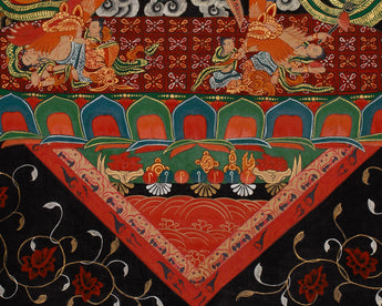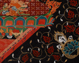 The thangka showcases an intricate floral pattern in vibrant hues that stand out strikingly against the black canvas. Careful use of gold highlights within these floral elements enhances depth and texture, creating a stunning appearance that animates the entire composition. This thangka's opulent materials, symbolic intricacy, and deep spiritual representation make it a significant piece for both practitioners and collectors.