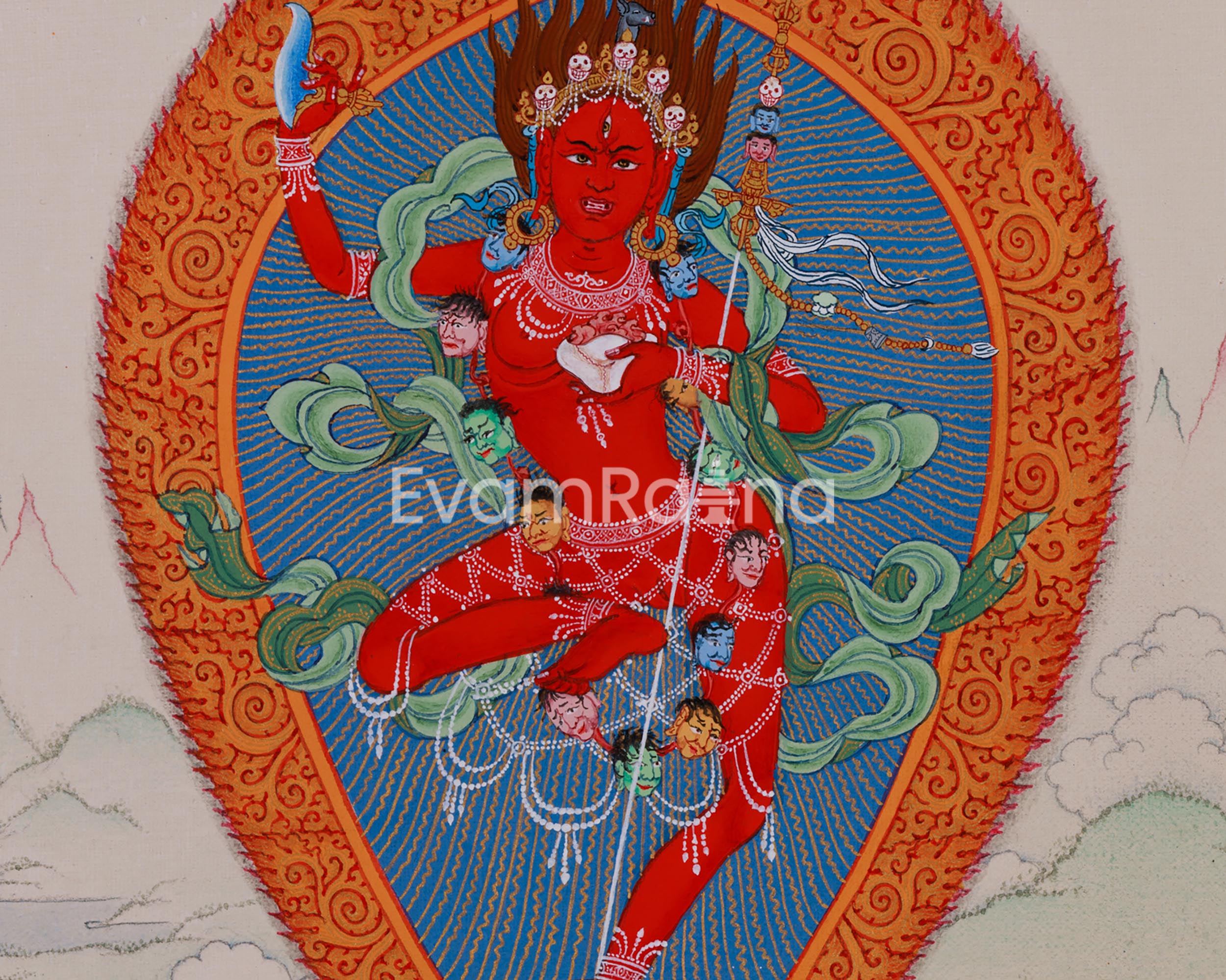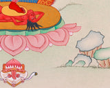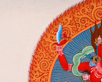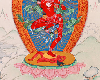 Journey into the mystical realm of Heruka Vajravarahi with this captivating thangka, meticulously hand-painted to evoke the essence of sacred Tibetan Buddhist art. Known for embodying the fierce yet compassionate energy of Dorje Phagmo, Heruka Vajravarahi represents the union of wisdom and skillful means. This traditional depiction showcases Heruka Vajravarahi adorned with symbolic attributes such as the vajra and skull cup, symbolizing her ability to transcend obstacles and transform negativity into enlightenment. Hand-painted by skilled Tibetan artisans, each brushstroke brings to life her serene yet powerful presence, making this thangka an ideal focal point for meditation and spiritual contemplation. Embrace the transformative power and profound wisdom of Heruka Vajravarahi as you explore the divine feminine energy in Tibetan Buddhist tradition through this authentic artwork.