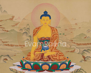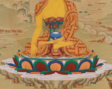 Shakyamuni Buddha, also known as Siddhartha Gautama, is the historical figure who achieved enlightenment and shared the path to liberation with the world. In this thangka, he is depicted in the Bhumi-Sparsa Mudra, or Earth Touching Gesture, symbolizing his spiritual awakening and the moment he called upon the earth to witness his profound enlightenment. The intricate details, including the folds of his robe and peaceful expression, are meticulously painted using natural Lhasa stone colors, ensuring authenticity and a divine energy. This thangka is a visual representation of Shakyamuni and a tangible manifestation of his teachings, offering beauty and spiritual depth for those seeking enlightenment.