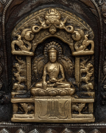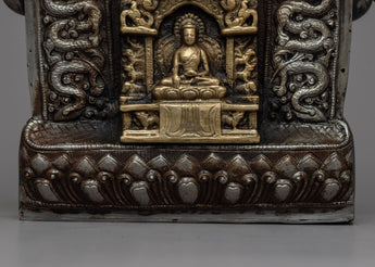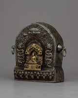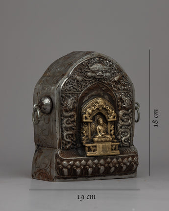 The intricately crafted brass statue that adorns the exterior of this Ghau Box is what makes it unique. This brass statue represents the spiritual core of Tibetan culture and is not just a decorative item. It is an 18cm tall captivating visual masterpiece that heightens the opulence of the space around you.