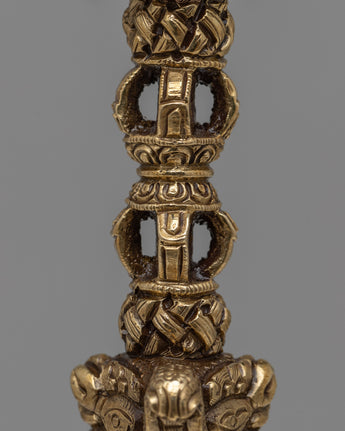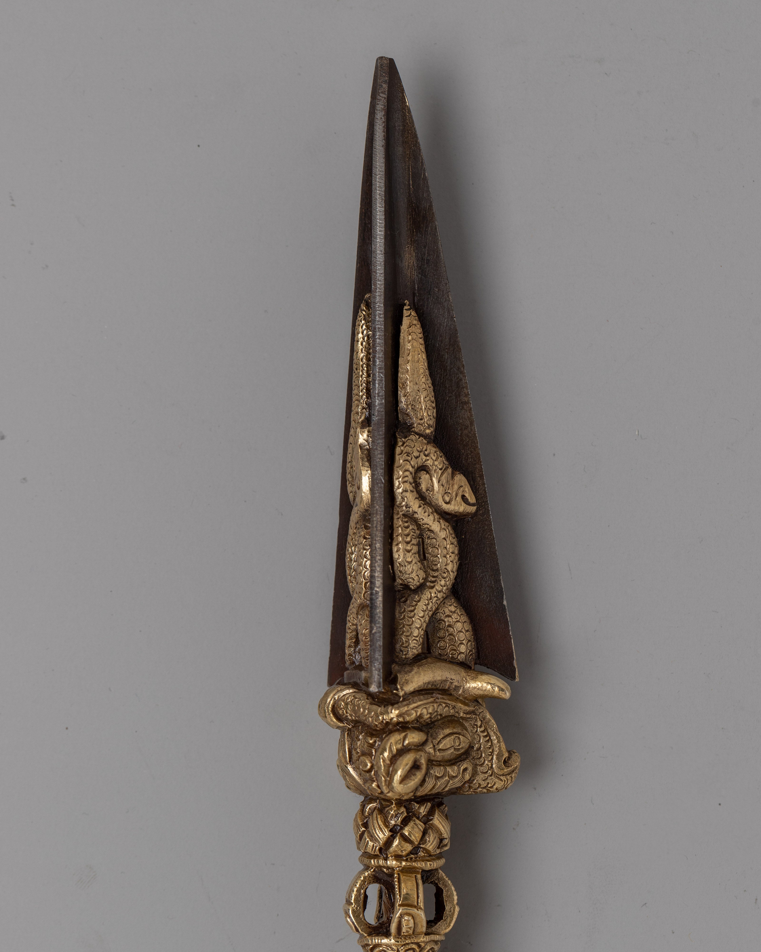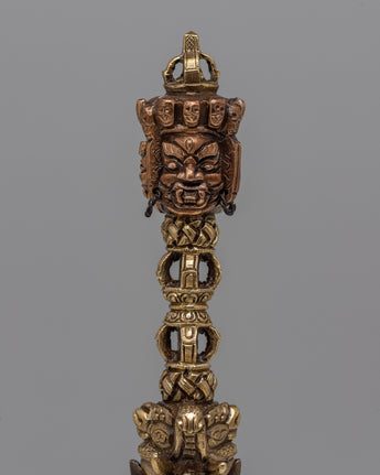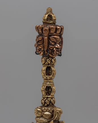 Carefully fashioned from copper and iron, the Iron Phurba on Altar is a sacred sign that can be found on any spiritual altar. Its size, 24 cm high by 3.5 cm wide, gives it a dominating presence and evokes the strength and vitality of the traditional phurba ritual blade. Its 0.52 kg weight achieves a balance between practicality and substantiality, making it appropriate for ceremonial usage as well as display.
