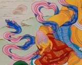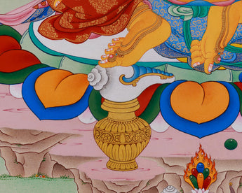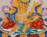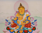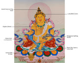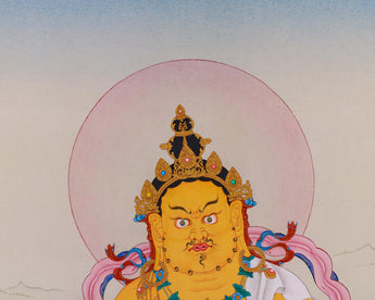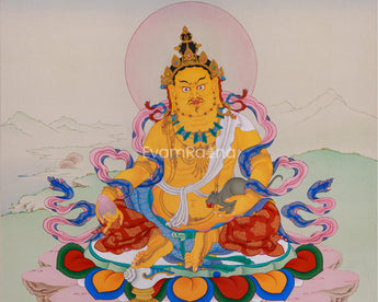 The Jambala Thangka is a unique piece from Enlightenment Studio, depicting the Wealth Deity of Vajrayana in vibrant 24K gold and natural stone colours. Perfectly sized for any space, this Thangka offers not only a beautiful addition to your decor but also a potential source of wealth and prosperity through its spiritual symbolism. Enhance your spiritual practice with this exquisite and powerful Thangka.
