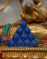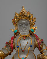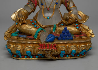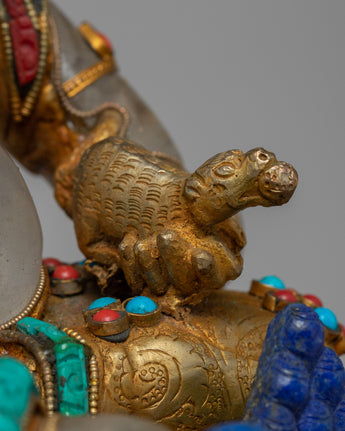 Presenting the Jambhala Prayer Statue: a divine representation of wealth and prosperity, painstakingly made by hand with minute details. Crafted on crystal, the goddess exudes a feeling of spiritual grace and divine presence. This statue, adorned with turquoise, coral, and lapis lazuli stones, gives off an air of grandeur and respect.