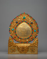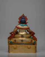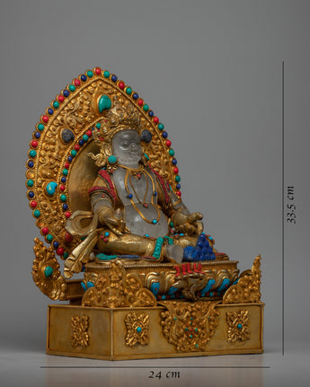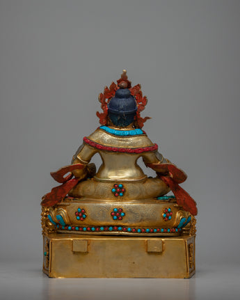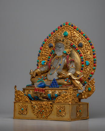 The statue's handcrafted, meticulously plated 24k gold part is constructed of copper, lending an opulent element to its overall appearance. The statue's grandeur is enhanced by a stately throne behind the god, which represents Dzambhala's divine authority and wealth blessings.