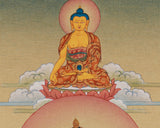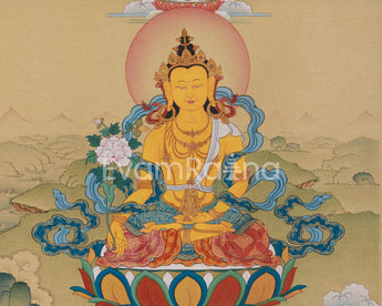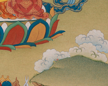 Above him, Ratnasambhava Buddha, the wisdom aspect associated with calmness and flourishing, is depicted sitting on a lotus seat, symbolizing purity and enlightenment. The surrounding scenery, with its gentle hills and delicate clouds, creates a tranquil and transformed atmosphere. This artwork embodies Kṣitigarbha's compassionate mission of guiding beings out of suffering, reflecting the knowledge and compassion of the Buddhas. This thangka is perfect for meditation rooms, places of worship, or as a spiritually significant gift. It embodies compassion, wisdom, and enlightenment.