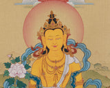 The thangka depicts Kṣitigarbha Bodhisattva seated on a vibrant lotus base in a vajra posture, symbolizing spiritual awakening and purity. The golden hues of his body represent his enlightened state and boundless compassion. This masterwork reflects the traditional Karma Gadri style, where Lhasa Stone contributes rich textures and vivid colors to intricate details, creating dynamic, lifelike images while maintaining a balance of clarity and depth. It was meticulously painted on cotton canvas using natural stone pigments. The application of pure 24K gold imparts a luminous glow to the deity, embodying his spiritual strength.