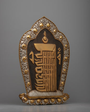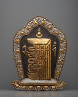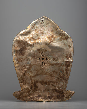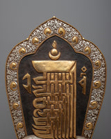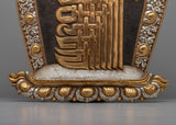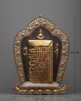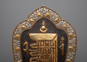 A masterwork of spiritual art, the Kalachakra Mantra Wall Hanging is carefully constructed on a copper body and adorned with both silver and 24k gold electroplating. With its celestial presence, this complex 44-cm-tall masterwork commands attention and adoration.