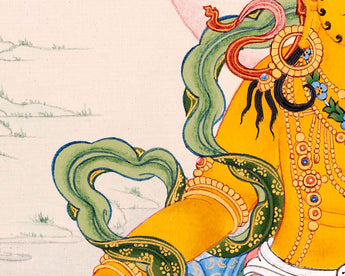 We have hand-painted the Tibetan thangka of Dzambhala (also known as Kubera) in traditional Karma Gadri Style. Wealth deity is seated atop a moon disc lotus seat where the vibrant halo illuminates his face while a blue nimbus engulfs his presence. A practitioner like you will be a tremendous meditating gift from Nepal. We have been adorned with precious jewels and rare turquoise to embellish ornaments. The indoor thangka will benefit you positively in various aspects of auspicious Buddhist traditions.
