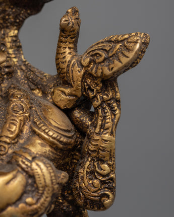 In the traditional Krishna statue, we have depicted the deity as being dressed in flowing robes with elaborate designs representing beauty and elegance. His hands hold the sacred flute, meaning his heavenly music and message, and his arms are lifted in a blessing gesture. Also termed as Gopala-Krishna statue it depicts Krishna on a cow. The characteristics of compassion, kindness, and harmony with nature are embodied by Krishna in this statue, who is shown as a compassionate and loving defender of his pet cow. His face exudes a strong sense of warmth and love. The fine details on the statue, such as the folds in Krishna's robes and the cow's delicate features, give the artwork a lifelike appearance.
