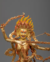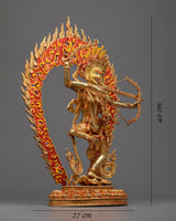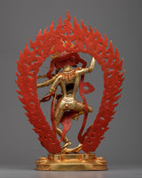 The Dakini is shown with a semi-wrathful expression on her face and roaring fire hair. She demonstrates both external and internal issues by dancing with her right leg up and stomping on a defeated person. She has four arms and a variety of ritual artifacts, implying that she can entice and enchant both men and women. She prepares to discharge a superbly crafted arrow with a flower-adorned shaft by drawing a gold bow with two hands. Her right-hand holds a wonderfully crafted flower goad made of gold, and her left hand holds a lasso. The statue took us months and months of hard work to create. The statue is gilded in genuine 24k Gold.
