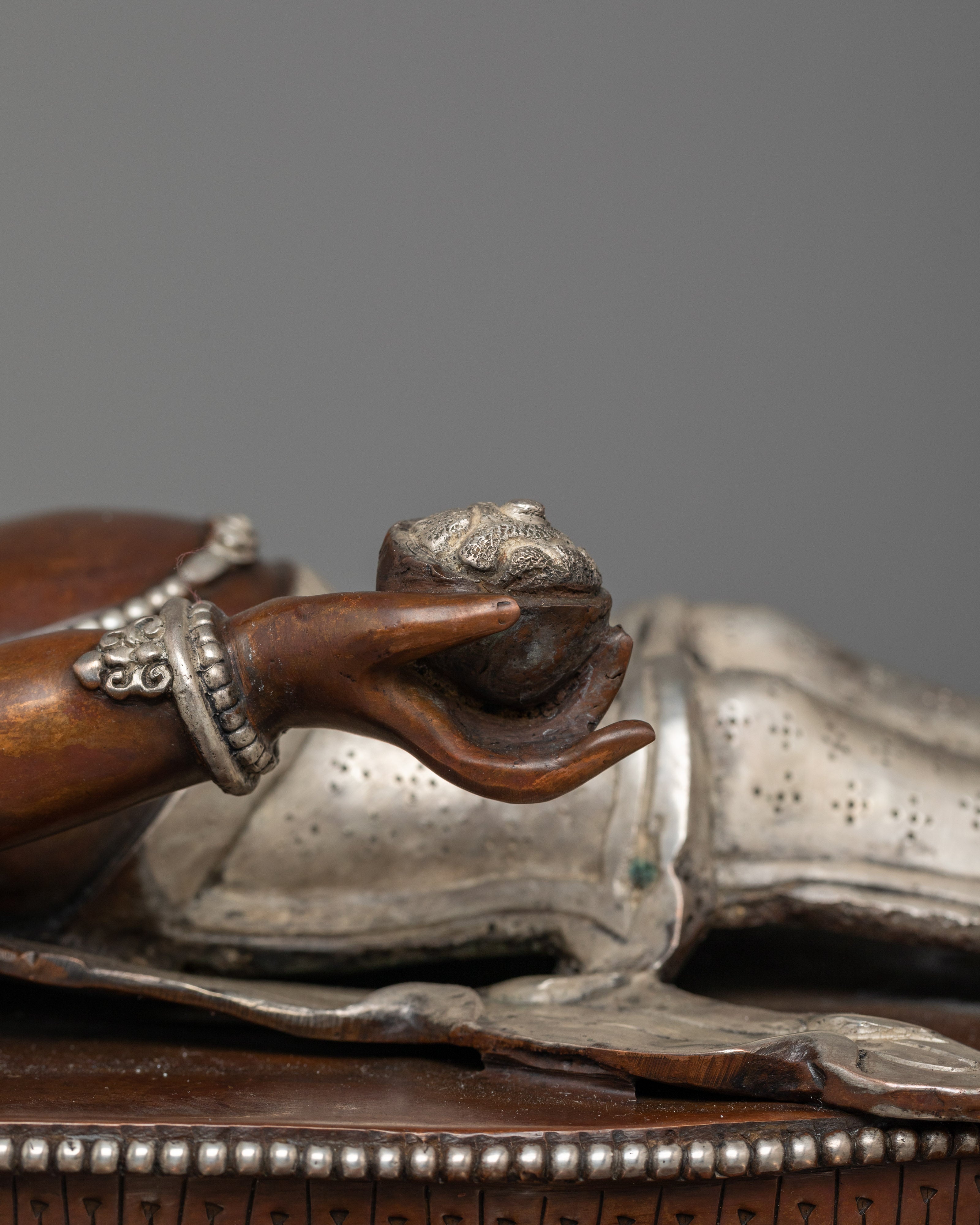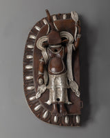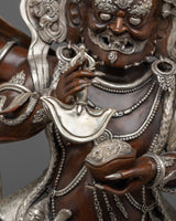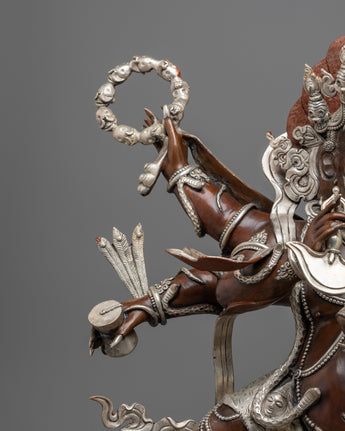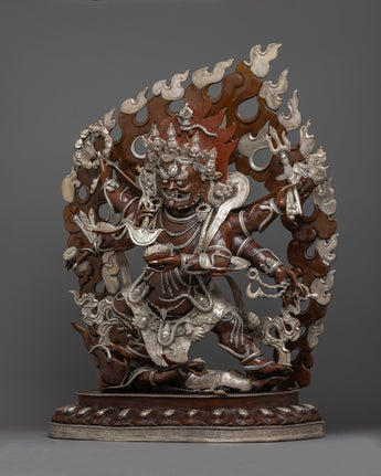 This handmade, oxidized copper and silver-plated statue depicts the powerful Buddhist deity Mahakala in his six-armed form. This intricately detailed statue symbolizes protection and power for any spiritual practice or sacred space. Experience the energy and presence of this divine figure in your home.