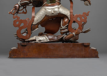 The statue stands at 25.98 inches tall and weighs 25.12kg. Mahakala is depicted standing on an elephant's body, representing the triumph of Mahakala, or good, over obstacles and challenges. The deity bears three pairs of arms that each carry an item symbolic of his divine powers that symbolize his ability to bestow protection. He can also be seen wearing a garland of skulls, representing life's transient nature and the ultimate victory over death. Every detail has been crafted with care and precision, resulting in a truly magnificent work of art.