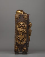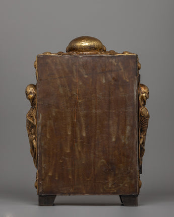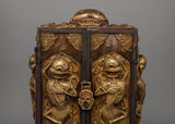 This Large Tibetan Ghau Box is a sacred Buddhist reliquary used to store amulets, spiritual items, and ceremonial objects. Made of iron and brass, it has elaborate carvings of protector deities and sacred symbols representing spiritual protection and heavenly blessings.