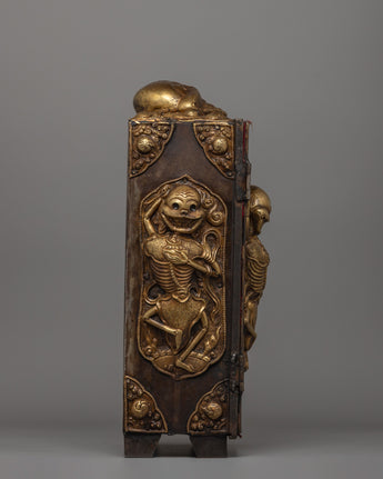 This shrine cabinet, 44 cm tall and 34 cm wide, displays specific craftsmanship with powerful imagery of guardian spirits and skull themes. These aspects remind me of impermanence and transformation, two critical teachings in Buddhist philosophy.