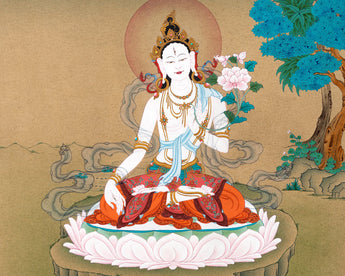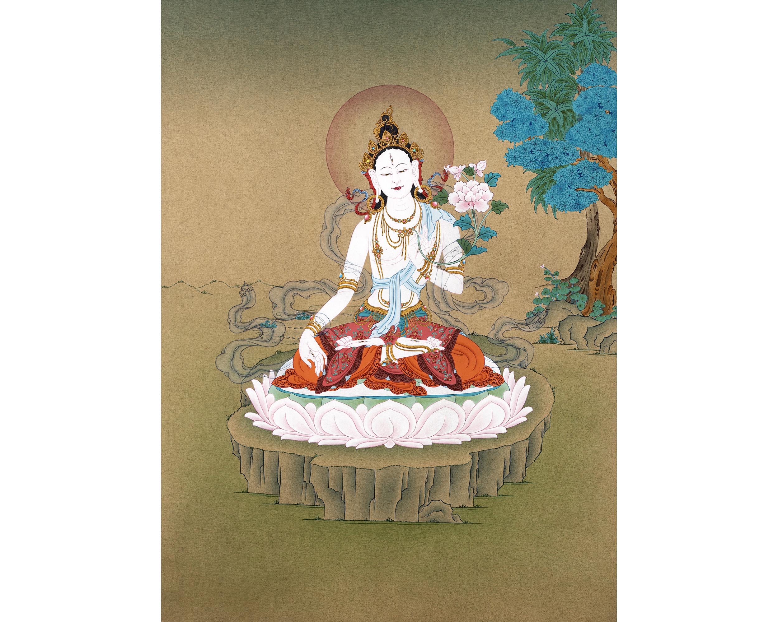Note: White Tara Thangka is an original painting from Enlightenment Studio, located at Boudha Stupa.