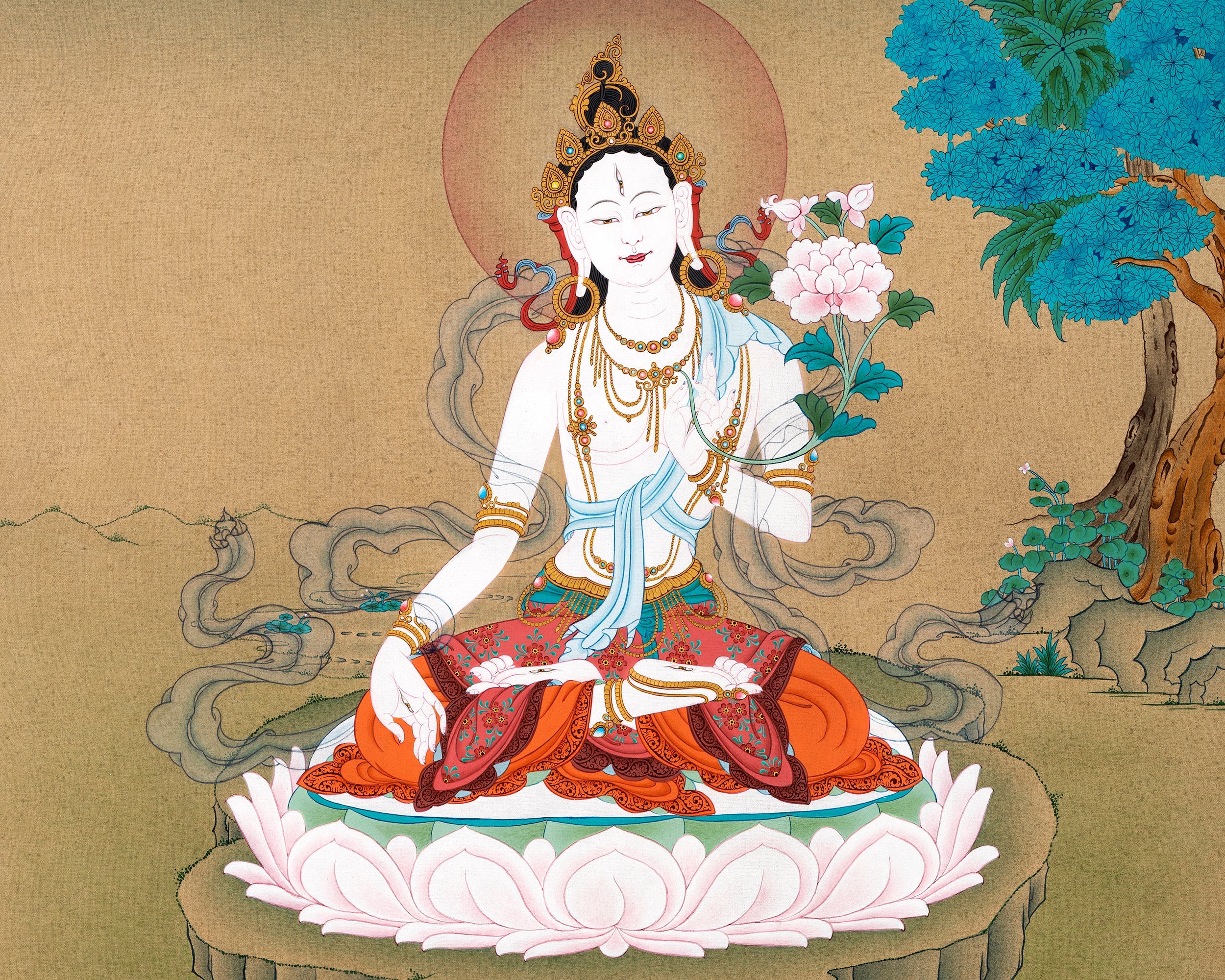 White Tara is a meditational deity practiced by the Vajrayana practitioners. White Tara (also called Dolma) is the female Bodhisattva of Compassion. She embodies the motivation of compassion in action, bestowing blessings of mercy and release from suffering. She engenders, nourishes, smiles at the vitality of creation, and has sympathy for all beings as a mother does for her children.