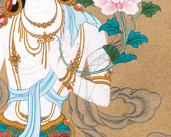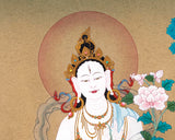 This large White Tara thangka was handmade by a Nepalese artisan using genuine 24k gold and natural stone color in the traditional karma gadri style. Nepalese artisans have passed down their skills from generation to generation, reflecting Buddhism. With a tranquil and peaceful expression, she sits on a moon disc lotus seat. A shimmering halo illuminates her face, and the exquisite and pleasant ambiance adds an excellent vibe to the thangka.