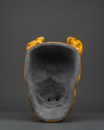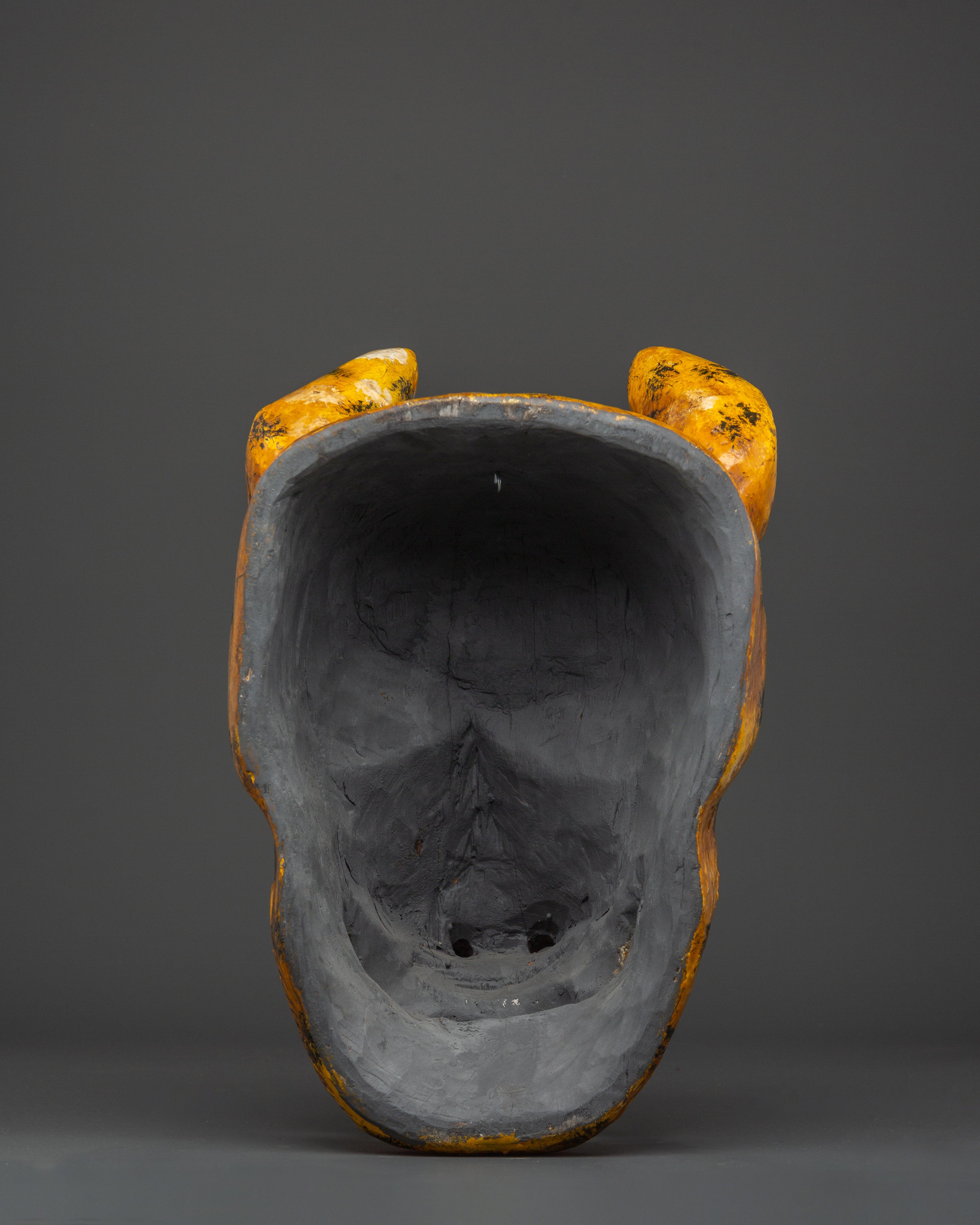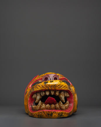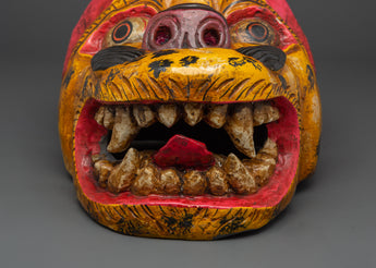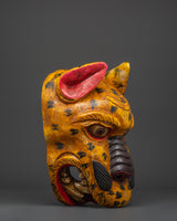 Every element of the mask, from the striking black and yellow highlights to the sculpted muzzle and bright eyes, is intended to draw attention and captivate any audience. This mask is a distinctive work of folk art and a protective wall talisman that has long been employed in ceremonial performances and spiritual exhibitions. This leopard mask will exude focus, passion, and spiritual meaning, whether displayed in a meditation room, cultural exhibition, or foyer.