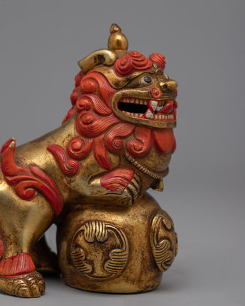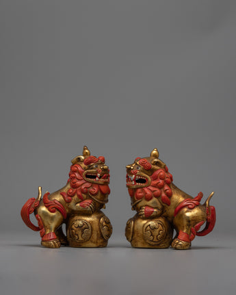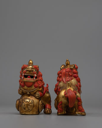 The exquisite pair of Foo Dog Lion Chinese Figurines is painstakingly carved from copper and exquisitely electro-plated in gold. Chinese culture views these figures as guardians, embodying the traditional symbolism of prosperity and protection. Every piece exhibits fine details that draws attention to the expert craftsmanship that went into making it. The gold plating gives the statues an opulent appearance, improving their aesthetic appeal and giving them a bright light.