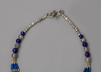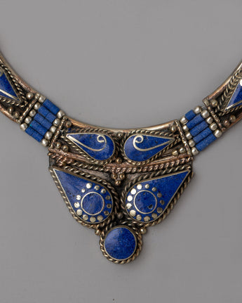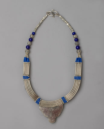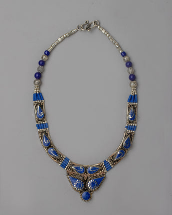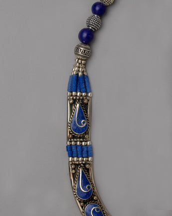 Our Tibetan Silver Necklace perfectly combines traditional craftsmanship and modern flair. It is handcrafted on a white metal body and embellished with beautiful silver plating, capturing the essence of Tibetan culture and beauty. Each bead contains lapis lazuli artificial powder, which provides a rich blue.