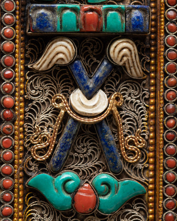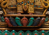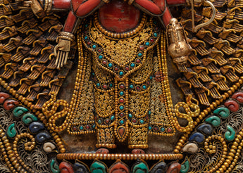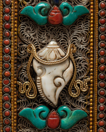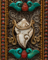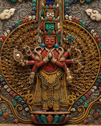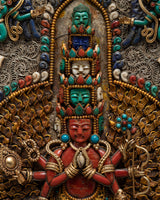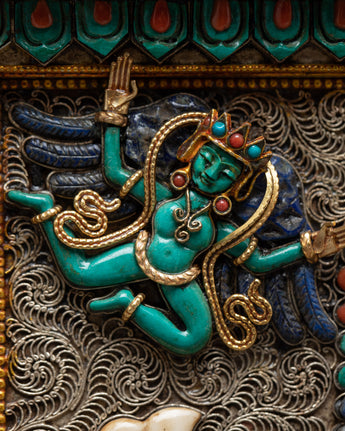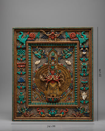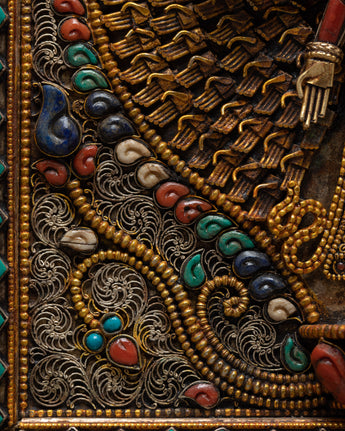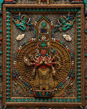 This one-of-a-kind Lokeshvara frame will completely transform the look of your wall. The wonderful intricate border frame is delicately decorated with classic filigree Seku craftsmanship. Because it was fashioned with actual stone, this wall art is unique, especially in the context of the Newari culture. The carving of the Bodhisattva Avalokiteshvara in the centre of the intricate frame adds a lovely touch to this piece of art.