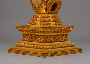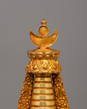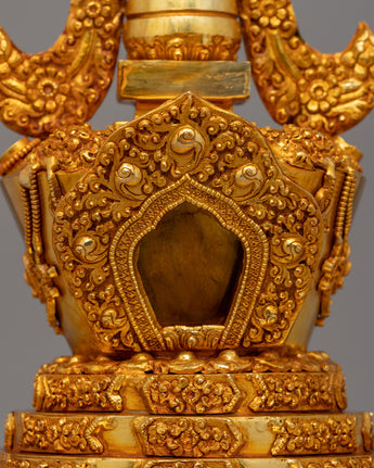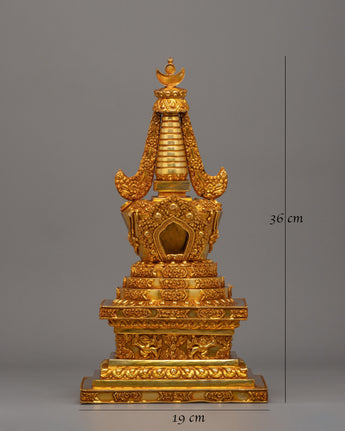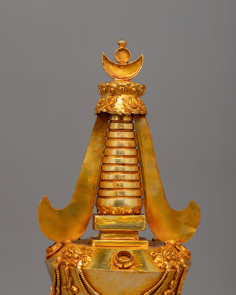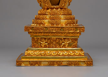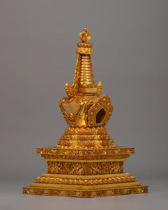 At its peak, the stupa takes on a majestic form, with gracefully curved extensions reaching outward, resembling the unfolding petals of a lotus flower. Intricate patterns that emphasize fluidity and movement further enhance these curved structures, representing spiritual development and enlightenment. The spire, crowned with a flame-like finial, adds to the stupa's regal appearance and completes its divine essence. The rich golden hue highlights each meticulously crafted detail, radiating warmth and sacred energy, making this an eye-catching and spiritually significant artifact.