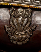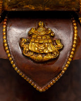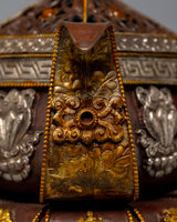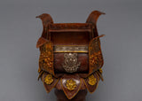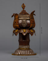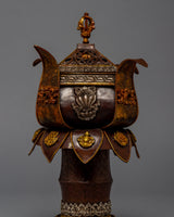 This Lotus incense burner is exquisitely made from copper and is copper and silver plated. Gold acrylic colours are used to create a stunning appearance. Its wonderfully done detailing makes it a beautiful piece for the shrine.