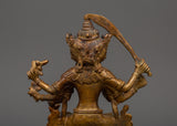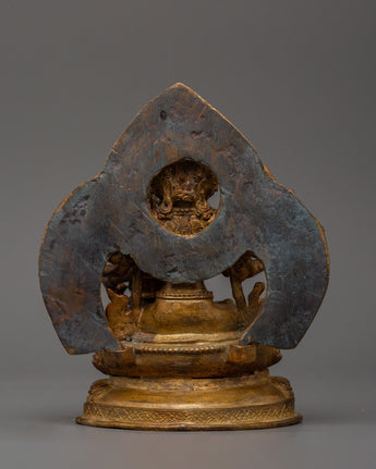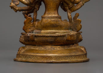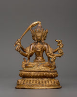 Maha Manjushri, the Bodhisattva of Transcendent Wisdom, is praised for wielding the sword of insight to dispel ignorance. This figure, seen in connection with his spouse, depicts the non-duality of wisdom and method, essential to Tantric Buddhist practice. The gold-plated copper structure increases the piece's spiritual luminosity, while the antique finish provides a timeless, religious appearance. This statue is ideal for Vajrayana practitioners, since it promotes clarity, transformation, and inner awakening.
