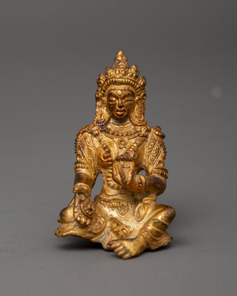 Maha Manjushri with Consort Statue is a stunning 16cm copper sculpture plated in gold and polished with an antique finish. This handcrafted piece, measuring 13.5cm broad and weighing 1.084kg, represents the tremendous combination of divine knowledge and enlightened energy, making it an exceptional addition to any Buddhist altar, meditation room, or spiritual collection.