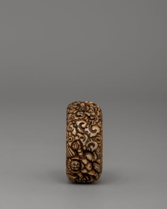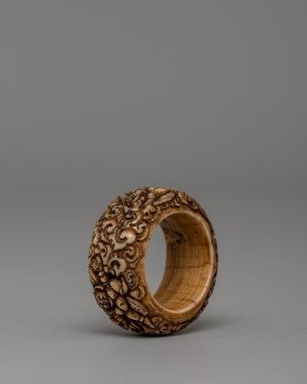 Mahakala's powerful presence in this ring is a protective barrier, symbolizing bravery and resistance against evil forces. The ring's rich textures and unique design showcase the craftsmanship passed down through generations of skilled artisans. This hand-carved Mahakala ring is more than just a spiritual ornament; it embodies protection, balance, and enlightenment. Whether worn for protection or displayed as a collector's item, this carved buffalo bone ring is an impressive addition to any collection.
