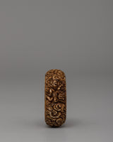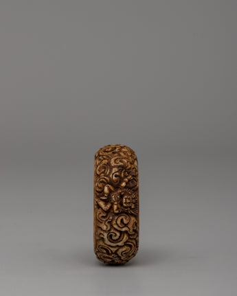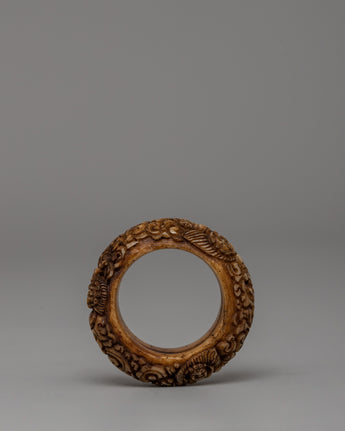 The Mahakala Carved Tibetan Ring is expertly hand-carved from sustainably sourced buffalo bone. This ring measures 2 cm in height and 3.5 cm in width, depicting the mighty Mahakala god. Mahakala, a revered deity in Tibetan Buddhism, symbolizes spiritual protection and power. The carving highlights the craftsmanship and spiritual significance, making it an excellent choice for anyone seeking a protective ring. Crafted with care and attention to detail, the ring has an 11 cm circumference and is designed for comfort while providing a profound connection to spiritual forces.