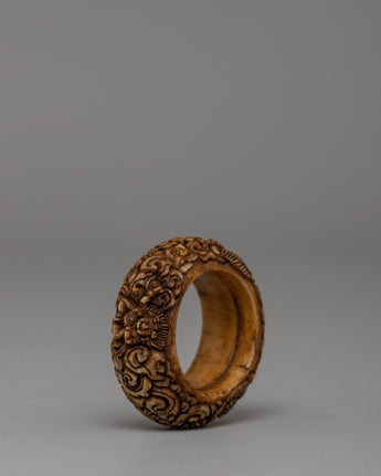 Buffalo bone is a long-lasting material with rich symbolic importance in Tibetan culture. The sculpture of Mahakala creates a sense of spiritual defense, protecting users from evil forces and energies. This Mahakala Carved Tibetan Ring is a spiritual accessory and a work of art representing power and balance. It's ideal for meditation, daily wear, or as a collectible piece. This handcrafted ring is valuable to individuals who cherish Tibetan spiritual traditions and workmanship, whether as a meaningful present or a personal symbol of protection.