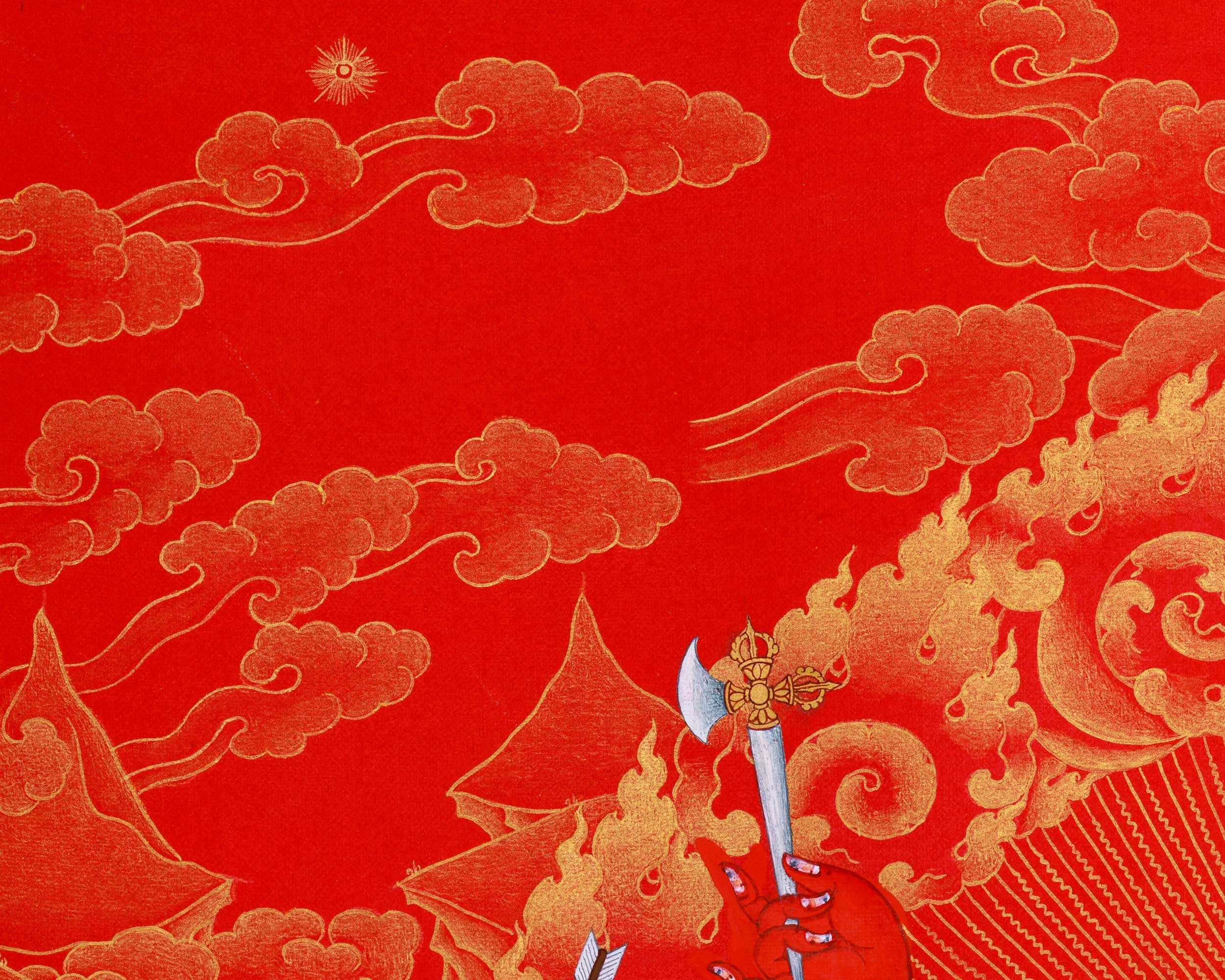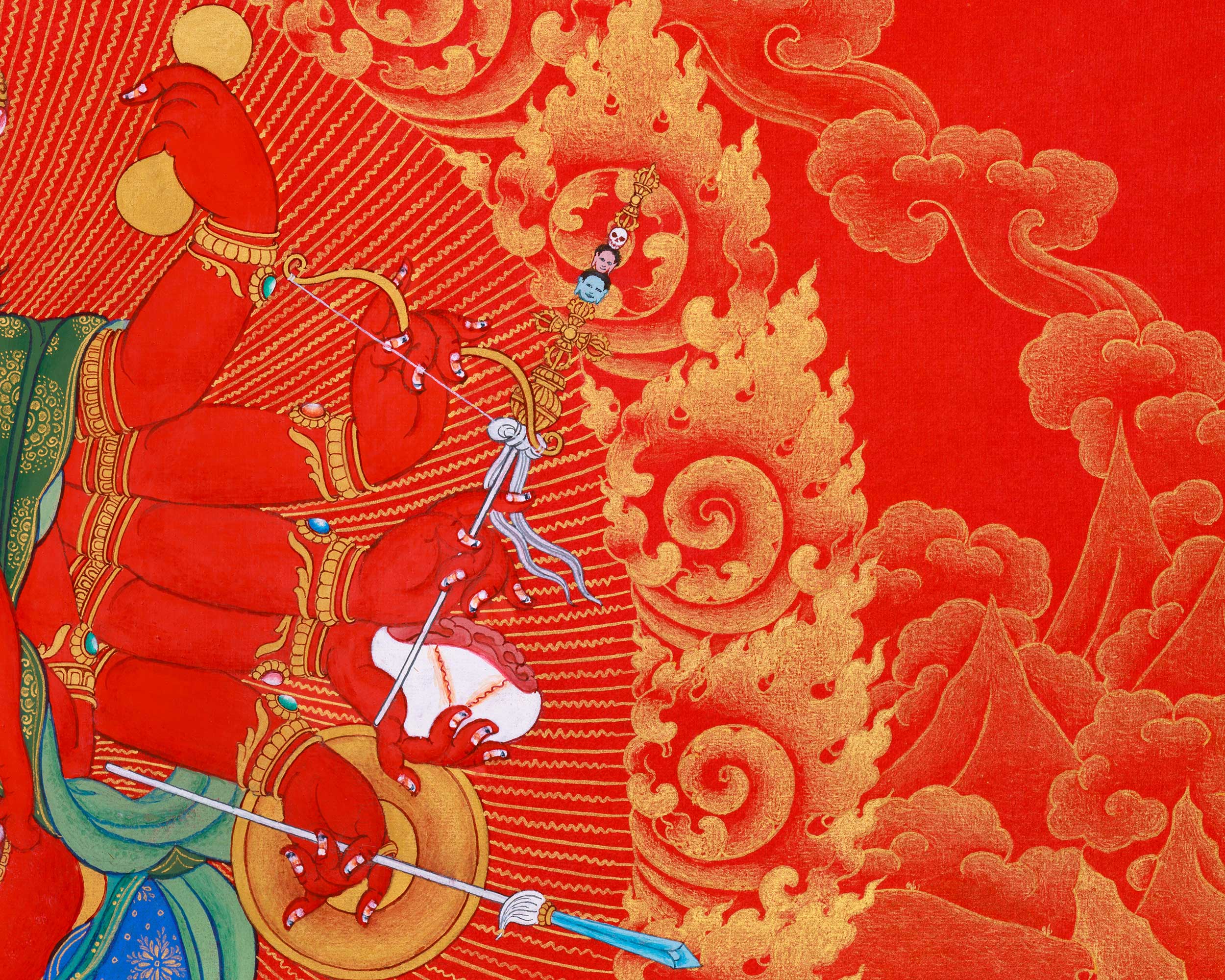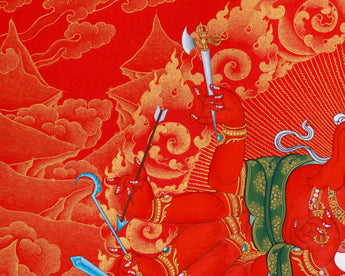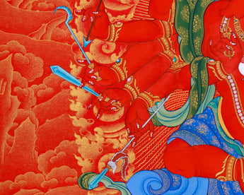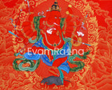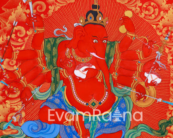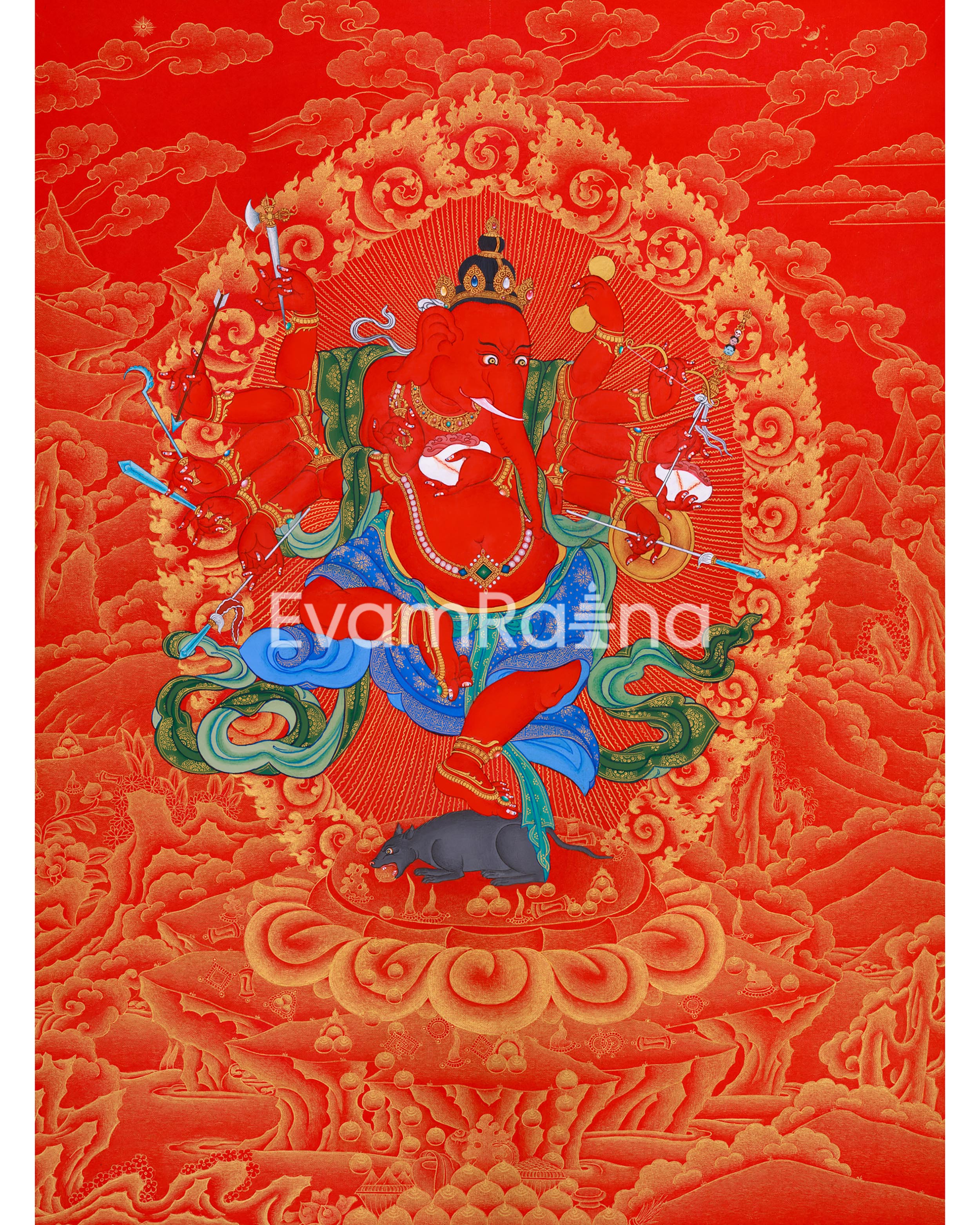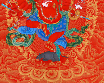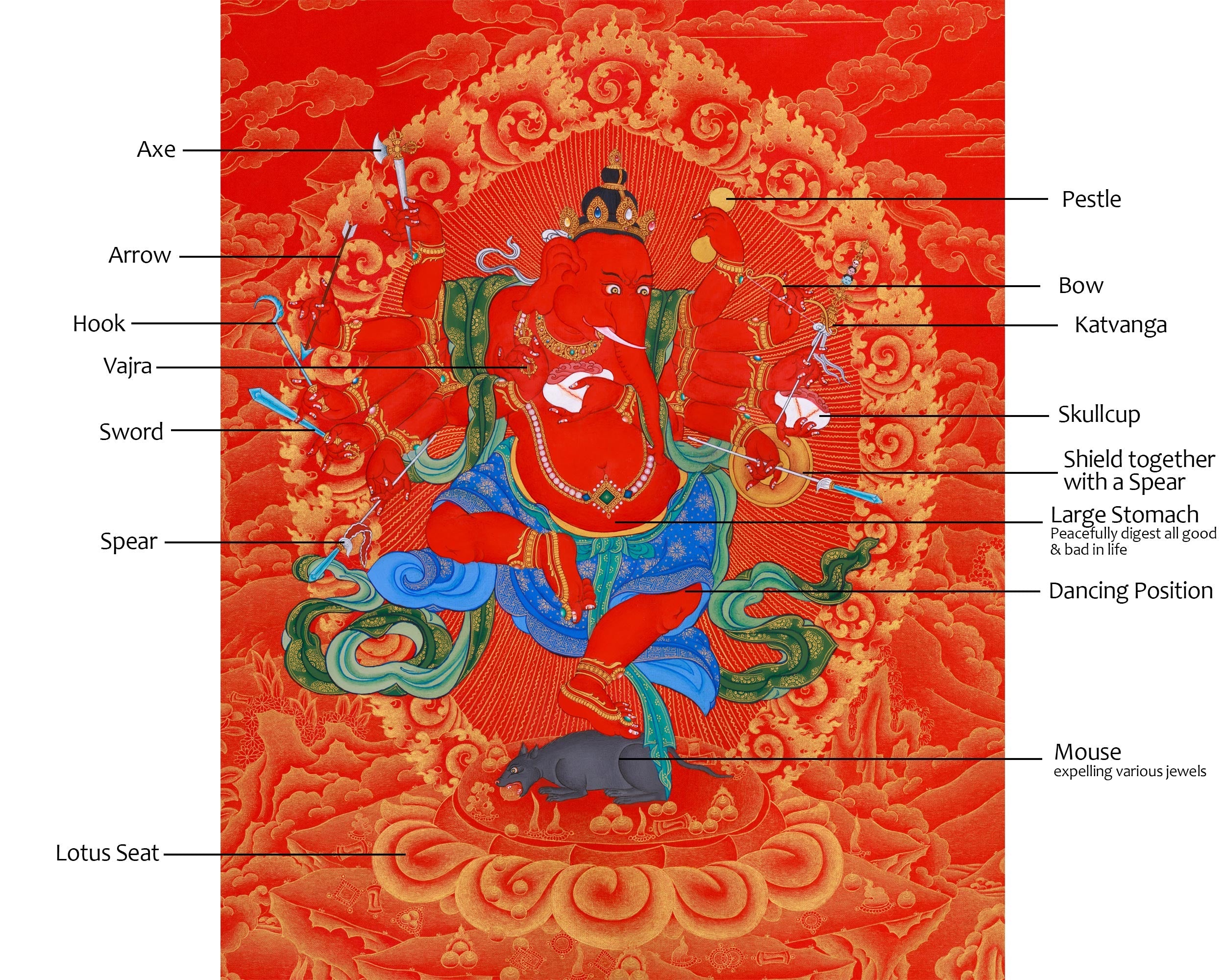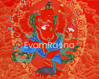 Ganesh, also known as Ganesha, Ganapati, Vinayaka, and Pillaiyar (Tibetan: tsog gi dag po) is one of the most well-known and most worshipped deities. We depicted Shri Ganapati with a body red in color, having an elephant face with sharp tusks, and possessing three eyes. His hair is tied in a topknot, and his crown is beautifully decorated with jewels on his head. His six right hands hold an axe, arrow, hook, vajra, sword, and spear. The six left holds a pestle, bow, katvanga, skullcup filled with blood, skullcup filled with human flesh, and a shield together with a spear and banner. Wearing various silks as a lower garment and adorned with a variety of jewel ornaments, the left foot is extended in a dancing position, standing upon a rat expelling various jewels.