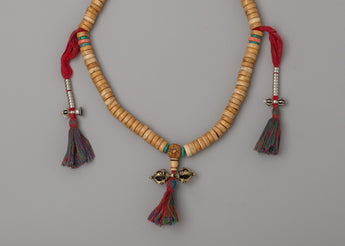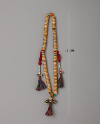 This Mala with Vajra at the End, 41 cm long and weighs 0.21 kg, is a beautifully crafted spiritual item made from ethically sourced yak bone. Yak bone is valued for its grounding and purifying properties, making it an ideal material for a mala traditionally used for prayer and meditation. The two chupsel at both ends of the mala provide a functional feature to secure the strands and add a unique cultural detail to the design.