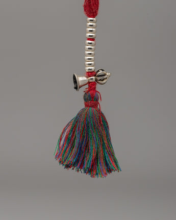 The mala also features a bead at the end, with a vajra at the tip. The vajra, symbolizing indestructibility and spiritual power, adds significant depth to the mala’s symbolism. The Chupsel (tassels) further enhance the mala's visual appeal, offering a traditional, handcrafted, striking, and spiritually meaningful look. The careful selection of materials, combined with the unique design elements, makes this mala a meditative tool and a meaningful piece of art, perfect for those seeking a blend of beauty, culture, and spiritual significance.