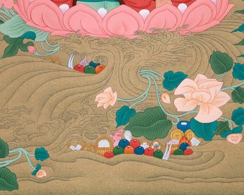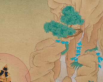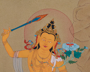 Delve into the profound teachings of Manjushri, the Bodhisattva of Wisdom, with this exquisite Himalayan thangka art. Manjushri is revered in Tibetan Buddhism for his embodiment of transcendent wisdom, symbolized by his sword that cuts through ignorance and his scripture that represents the teachings of enlightenment. This traditional thangka, meticulously painted by Himalayan artisans, captures Manjushri in a state of serene contemplation, radiating spiritual wisdom and compassion. His left-hand holds a blue lotus flower bearing a book of wisdom, while his right hand wields a flaming sword that symbolizes the sharpness of wisdom cutting through delusions. Each intricate detail in the thangka reflects the rich iconography and deep spiritual significance associated with Manjushri, making this artwork a powerful tool for meditation and spiritual growth. Perfect for those seeking clarity of mind and insight into the nature of reality, this Manjushri thangka invites you to embrace the path of enlightenment and spiritual awakening through the timeless wisdom depicted in Himalayan Buddhist art.