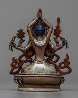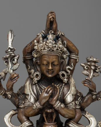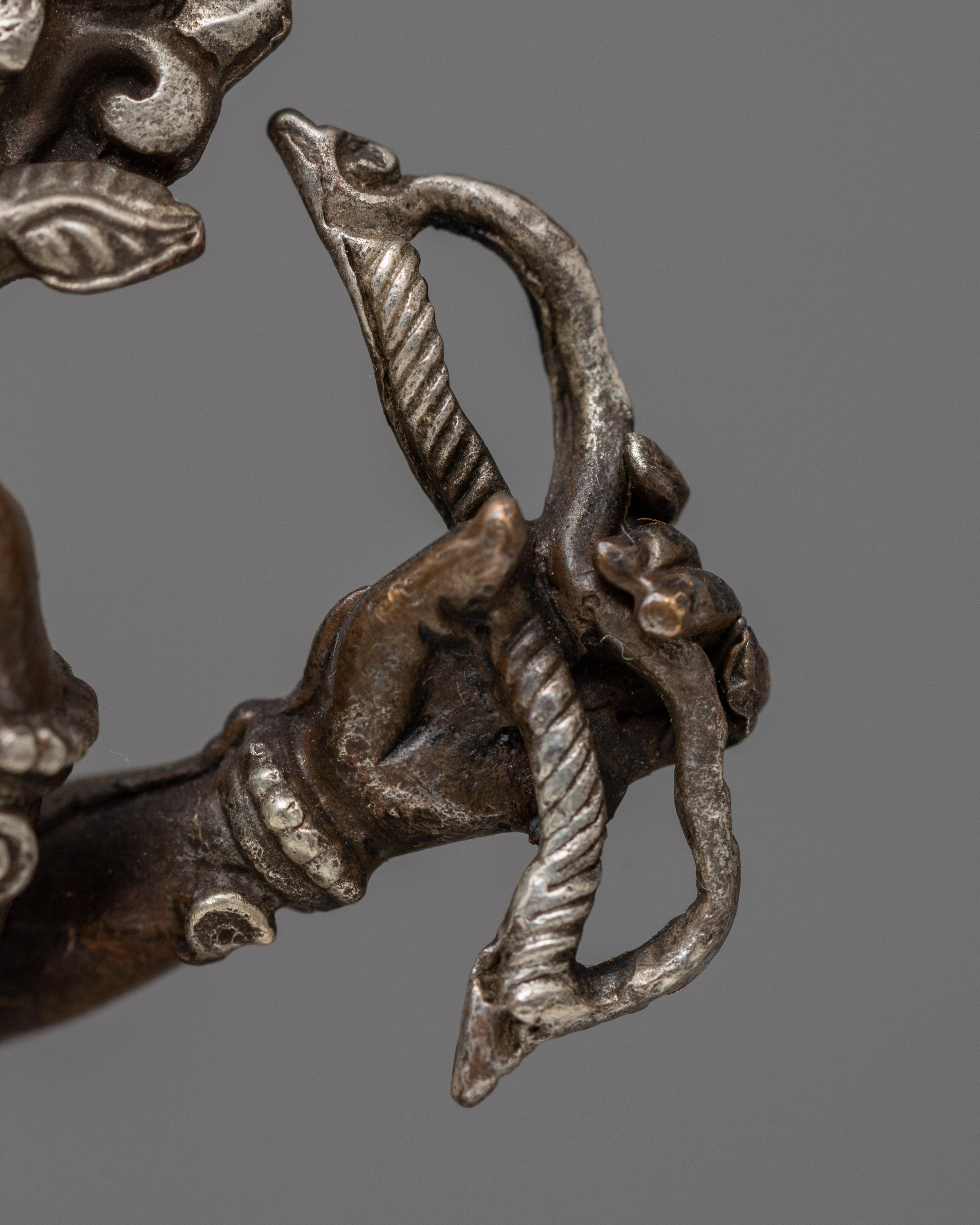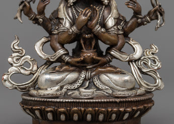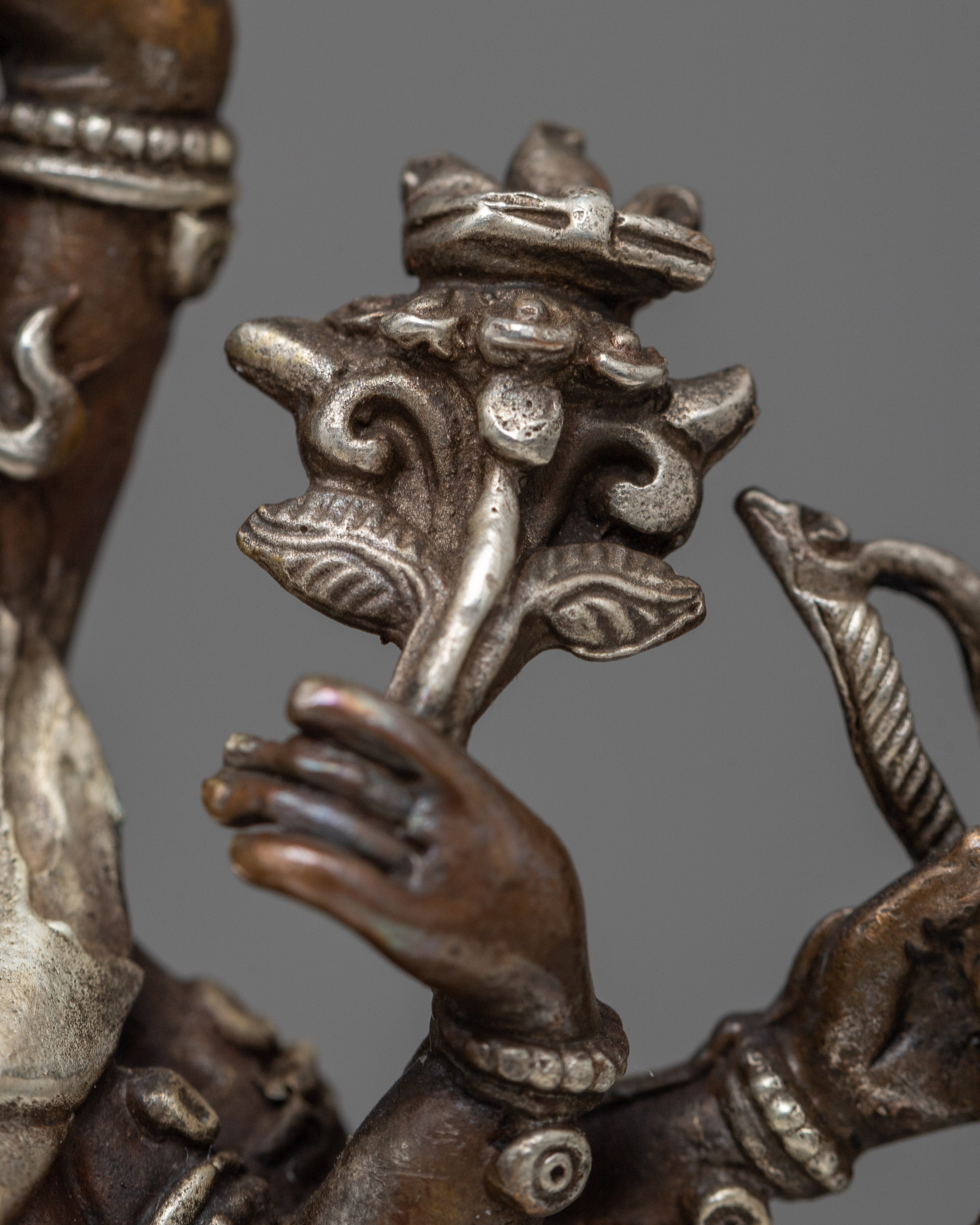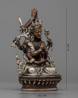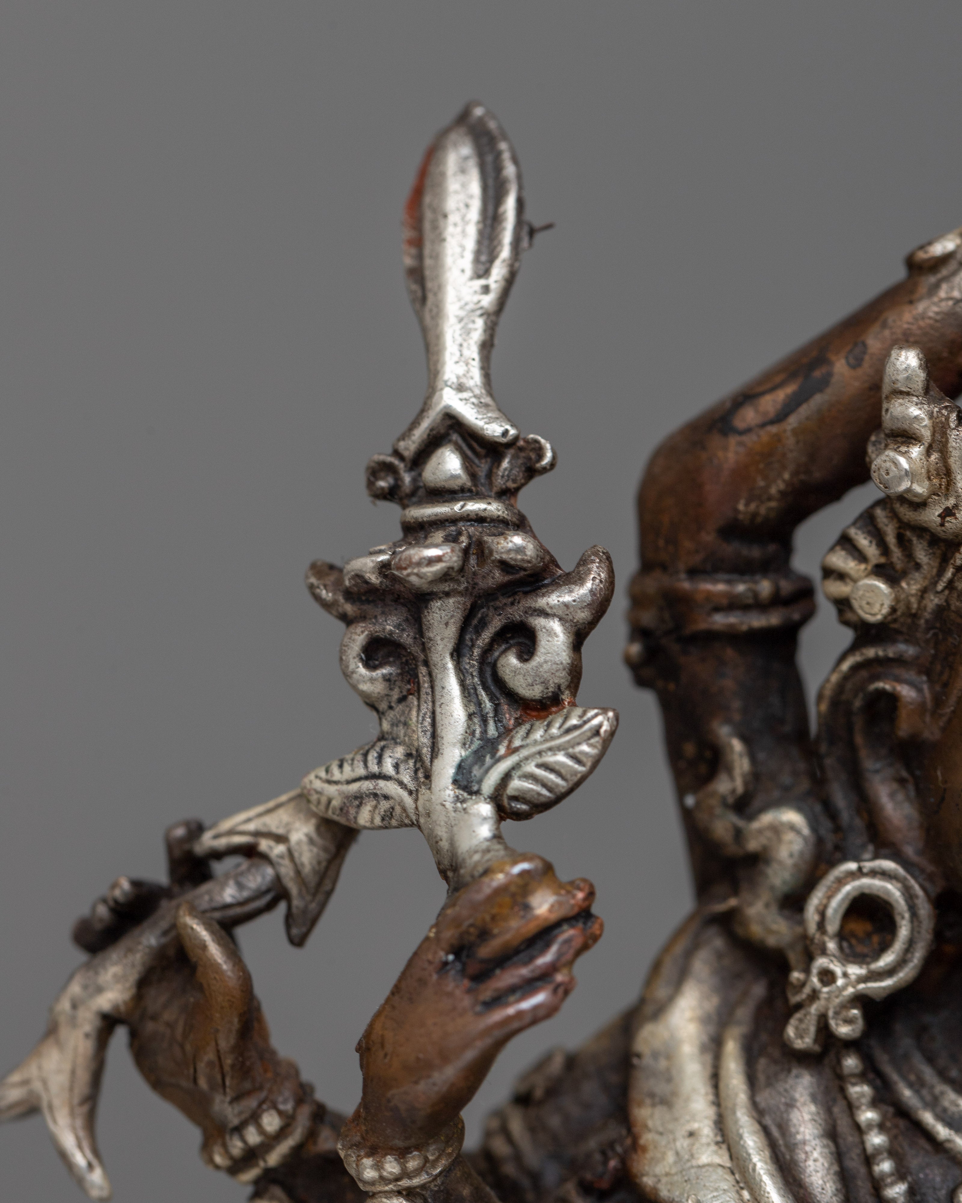 This magnificent statue, which is beautifully embellished with bright silver plating and painstakingly made utilizing machine techniques on an oxidized copper body, will help you embrace the sacred presence of the Manjuvajra Namasangiti. This statue, which stands elegantly at 11 cm in height and 8.5 cm in breadth, exudes enlightenment and spiritual depth. It offers a substantial and profound touch to any religious area, weighing only 0.36 kg.
