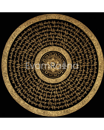 Hand-painted with acrylics on high-quality cotton canvas, this Thangka brilliantly depicts spiritual energy. The gold or silver embellishments within the mantra not only enhance the artwork's beauty but also amplify its spiritual power, filling the space with divine energy and protection. The black canvas background adds depth, emphasizing the mantra and all of its intricate details, making it a powerful addition to any shrine or meditation area.