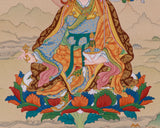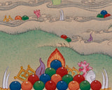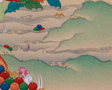 The Master of Tantras Guru Rinpoche Thangka is a revered depiction of Padmasambhava, who introduced Tantric teachings to Tibet. Hand-painted on cotton canvas with natural stone colors, this painting is a symbol of Tibet's spiritual heritage. The earthy tones are derived from sacred minerals, while the use of 24K gold enhances the divine essence. Created in the Karma Gadri style, this thangka harmoniously combines traditional artistry with enduring spiritual significance, making it a compelling addition to any sacred space.
