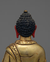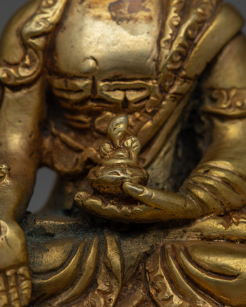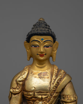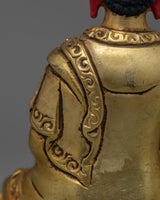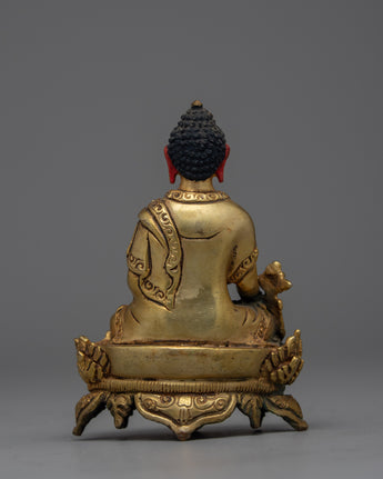 Presenting the Medicine Buddha Sutra Recitation Practice Statue, an expertly made sculpture that captures the calm and compassionate nature of the Medicine Buddha. This magnificent statue, which has a fine copper body and an attractive gold plating, represents compassion, healing, and knowledge. The Medicine Buddha is depicted in a meditative pose with a sutra in hand, signifying the recitation of healing prayers and teachings, given to the exquisite craftsmanship.