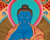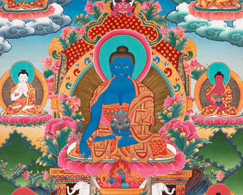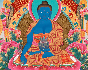 Medicine buddha or the healing buddha is said to dispense spiritual medicine when properly worshipped. It is even believed that an efficacious cure may be accomplished by merely touching the image. His right-hand holds a branch of the myrobalan plant in the varadamudra posture or the giving gesture. His left hand is on his lap, holding a lapis lazuli pindapatra or a container containing medicines.