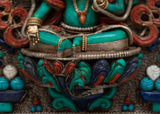 A mix of Artificial and genuine stones are embedded in the artwork, adding to its visual appeal and spiritual soul. Artificial turquoise stones enhance the intricate design, while genuine lapis lazuli, coral shells, and coral stones provide authenticity and depth. The use of these stones not only enhances the appearance of the artwork, but also imbues it with the mystical energy connected with each stone's characteristics.