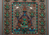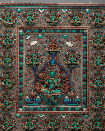 The Green Tara Metal Artwork Wall Hanging is an expertly produced artwork that exhibits the beauty and meaning of Tibetan Buddhist art. This artwork, created on a copper body and embellished with delicate silver plating, exudes beauty and spiritual importance. With measurements of 47cm in height and 41.5cm in breadth, it makes an eye-catching centerpiece in any sacred space or home altar.