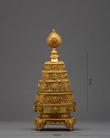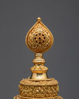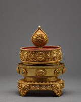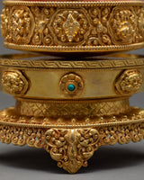 The mandala is a gold-plated set with all the auspicious symbols carved in it. The bottom circle has dragons carved on all sides which represents abundance and prosperity along with studded gems. The mandala is also carved with flowers that symbolize good luck. The carving details are done very finely.