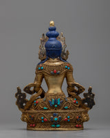 The intricate design contains precious coral and turquoise stones that have been carefully inlaid to imbue the statue with symbolic significance. Coral represents vitality and protection, whereas turquoise symbolizes peace and spiritual harmony. They combine to form a harmonious fusion of energies, inviting practitioners to accept Mitrugpa's protective embrace.