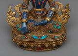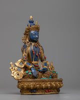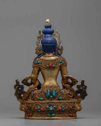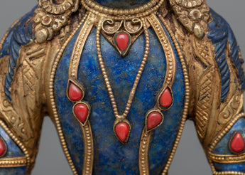 Presenting the Mitrugpa Deity Statue, a magnificent symbol of spiritual protection and guidance. Carved from majestic lapis lazuli stone, this statue exudes divine presence and inner strength. The sections adorned with gleaming 24k gold plating are meticulously crafted from copper, ensuring both durability and elegance.