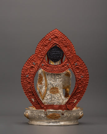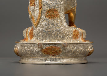 The Mitrugpa Buddha is serenely seated atop a moon disc lotus seat in a lotus posture. The lotus motif represents purity, enlightenment, and the triumph of spirit over adversity. The Mitrugpa Buddha symbolizes clean water, wisdom, and the ability to reflect objects without being affected by them. He holds a vajra, a ritual item, in his right hand while performing the 'Bhumisparsa mudra,' representing the moment the Buddha attained enlightenment, claiming the earth as his witness with his left hand. Its wonderfully crafted craftsmanship and spiritual significance make it an essential piece for Buddhist art collectors and those seeking spiritual connection.