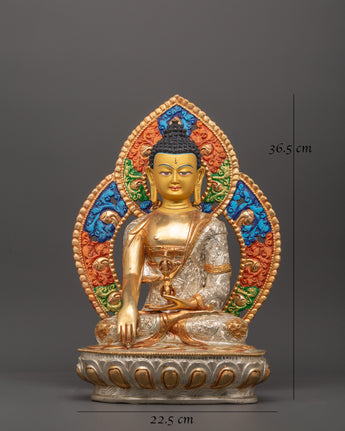 This magnificent Mitrupa Buddha statue stands 36.5 cm tall and 22.5 cm wide, making it an essential and captivating spiritual piece for your home or meditation room. Crafted from copper and plated in silver and gold, this statue portrays Mitrupa, a beloved Buddhist figure known for embodying knowledge, compassion, and spiritual achievement. The halo adorned with floral designs symbolize purity and spiritual enlightenment; the beautiful acrylic colors enhance the statue's detail and brilliance, transforming it into a striking decorative item that fills any space with positive energy.